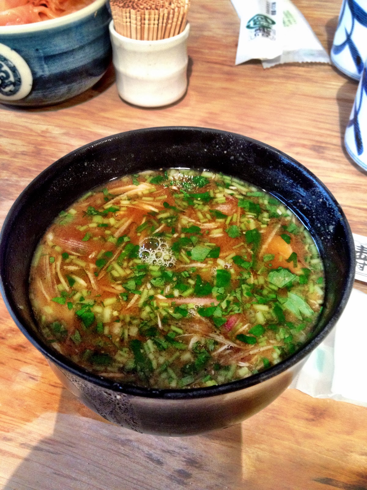 All this time, I have been fooled with the miso soup in California.. This is the real deal miso soup. Er mah gawd.. It's so much more than you think. It has clams and stuff I don't even know that is in this real miso soup.